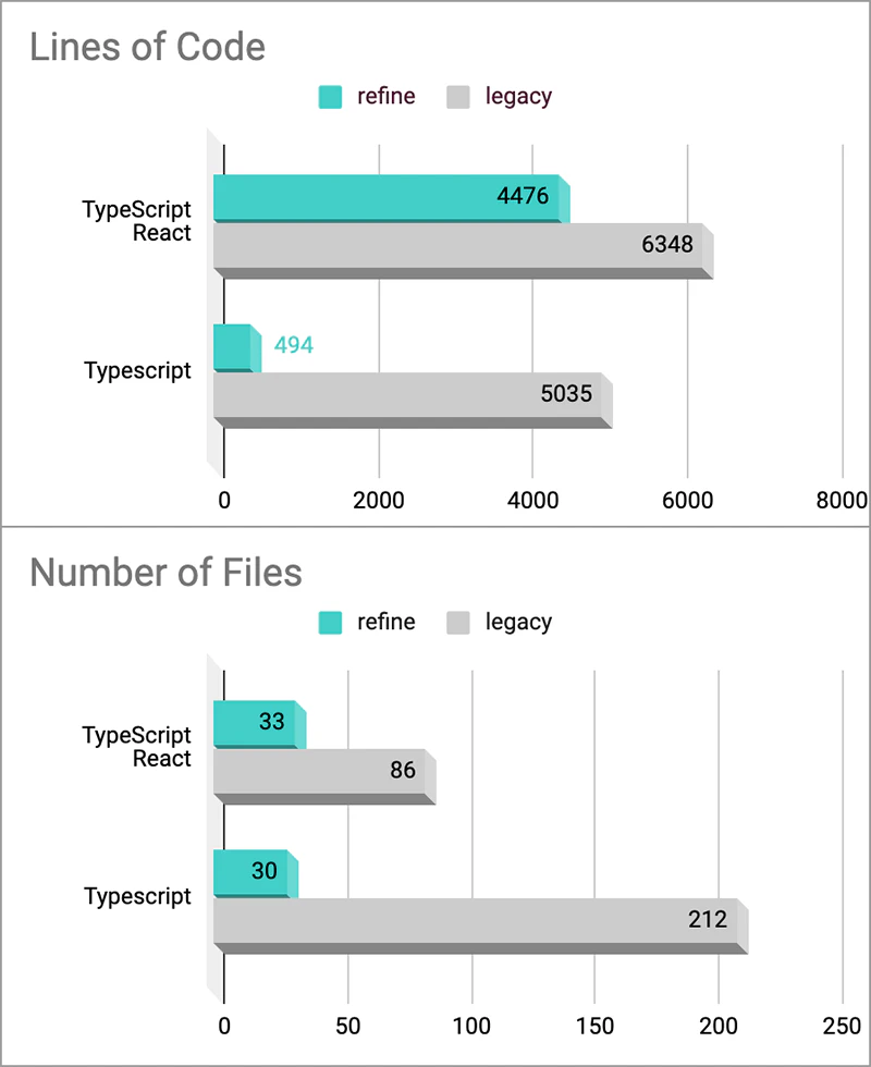 refine makes your codebase significantly smaller, by eliminating redundant code such as reducers, actions, and unit tests. We've measured a significant reduction in project size in terms of "lines of code" and "number of files":